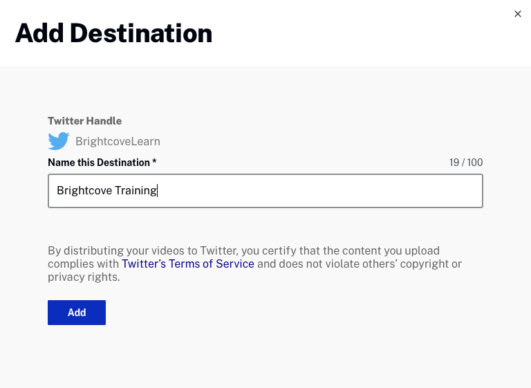 Twitterフィードに動画を公開する場合は、Twitterの宛先を作成します。Twitter の宛先を作成するには、次の手順に従います。