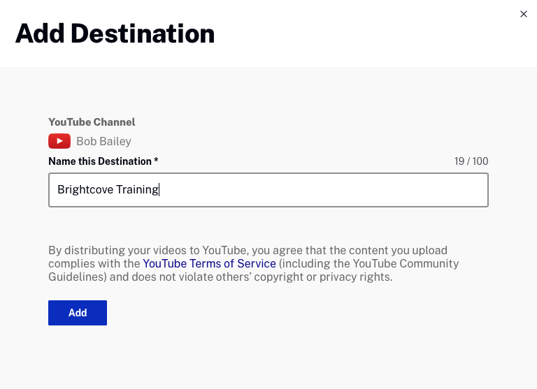 YouTube チャンネルに動画を公開する場合は、YouTube の宛先を作成します。YouTube 配信先を作成する前に、YouTube アカウントを確認することをお勧めします。アカウントの確認が完了すると、15 分以上長い動画をアップロードできるようになります。