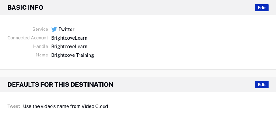 ソーシャルプラットフォームに動画を公開するときに、送信先のデフォルト値がデフォルトの動画プロパティとして使用されます。Twitter宛先の公開のデフォルトを設定するには、送信先の名前をクリックし、「この宛先のデフォルト」セクションで「編集」をクリックします。