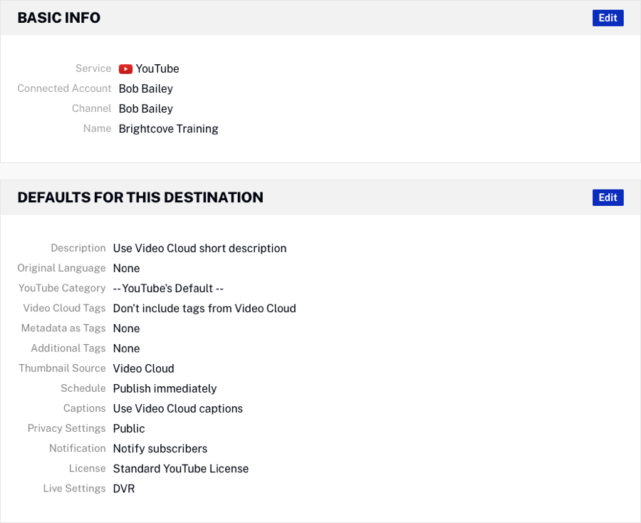 - 基本情報と保存先のデフォルトが表示されます。クリック編集のボタン基本情報宛先名を編集するセクション。を参照してくださいYouTubeのデフォルトを設定するデフォルト値の構成については、セクションを参照してください。