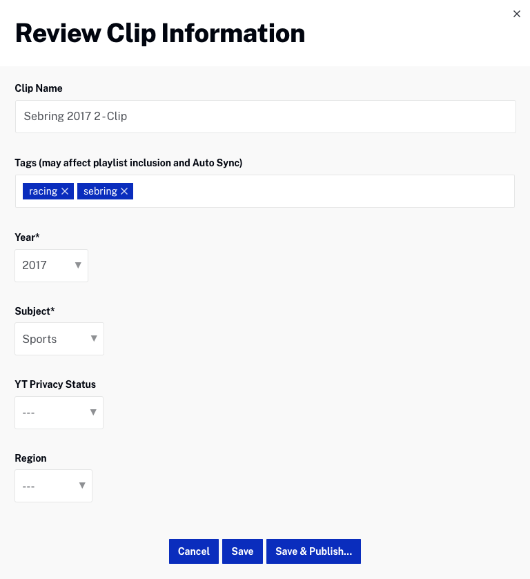 - クリップ情報を確認します。クリップ名、タグ、アカウント用に作成されたカスタムフィールドの編集が可能です。