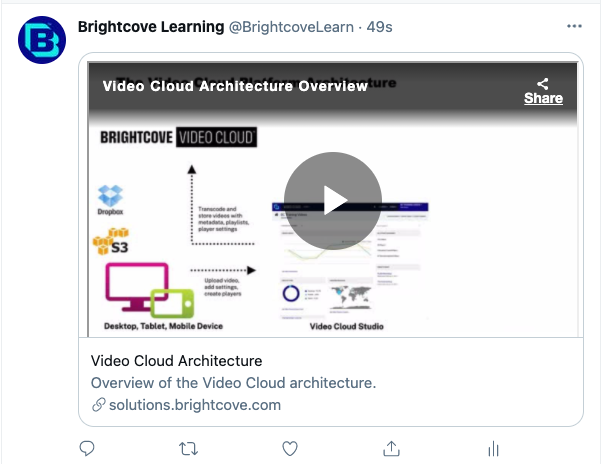 デフォルトでは、視聴者が Brightcove Player のソーシャル共有機能を使用して動画をツイートすると、動画を含むページの URL が視聴者の X フィードに表示されます。