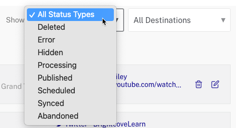 Auto Sync が使用されていて、ソーシャルプラットフォームのビデオメタデータを更新するように同期ルールが設定されている場合、同じビデオの複数のエントリがリストに表示されることがあります。たとえば、動画が最初に同期されたときにエントリが表示され、動画メタデータが更新され、ソーシャルプラットフォームと同期されると、追加のエントリが表示されます。