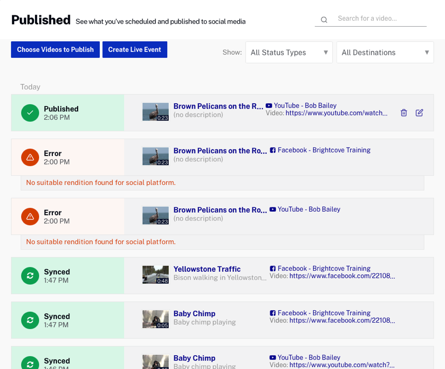 このトピックでは、Brightcove Socialを使用して、ソーシャルメディアアカウントに投稿された、または投稿が予定されているビデオのステータスを監視する方法を学習します。