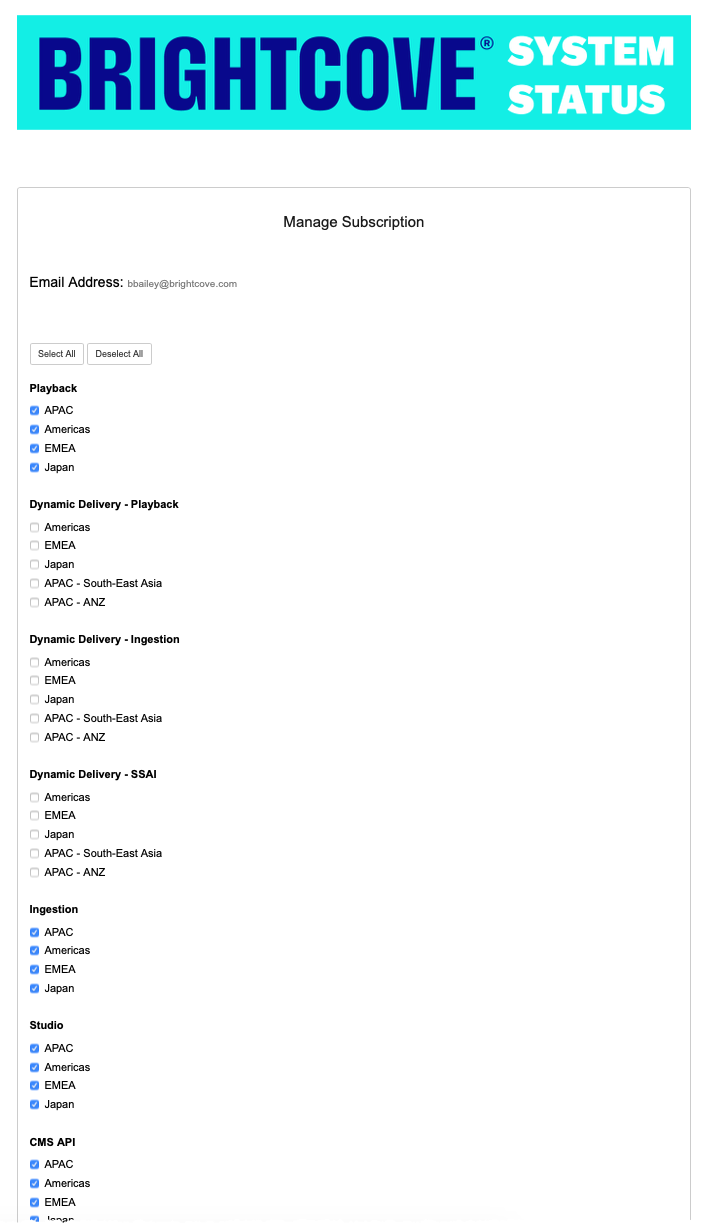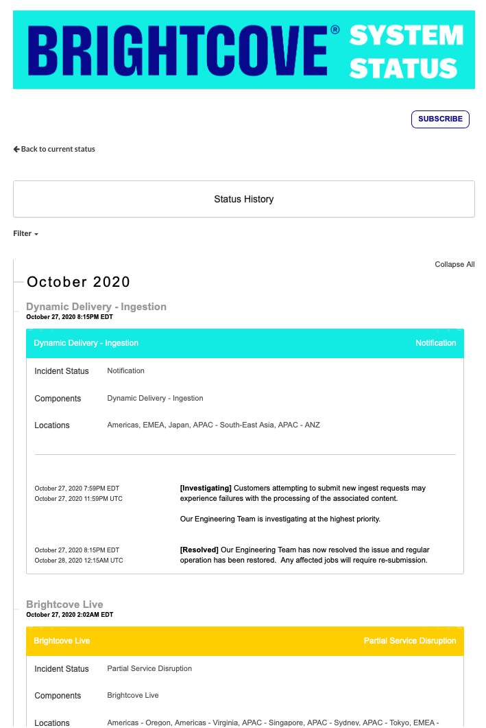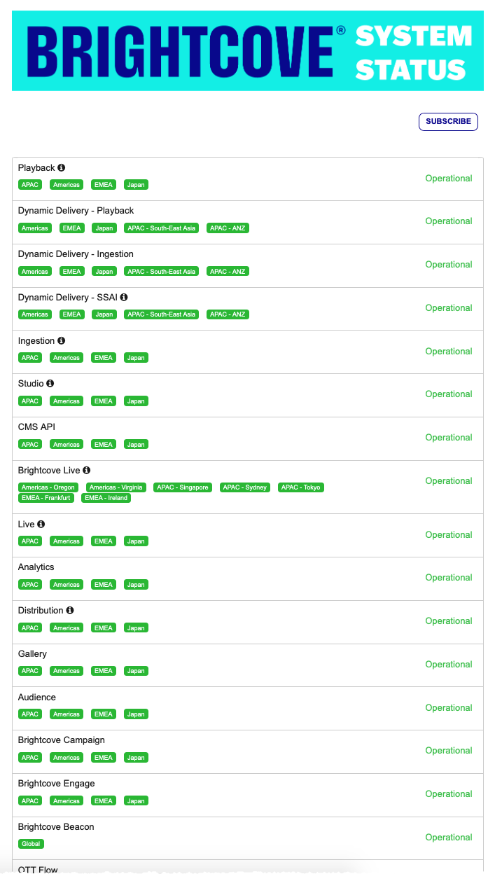 Brightcove は、すべての Brightcove サービスおよびアプリケーションのステータスを常に監視しています。サービスに中断が発生した場合は、システム ステータス ページに通知が掲載されます。すべての計画メンテナンス通知もこのページに掲載されます。