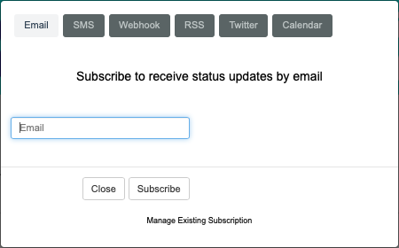 システムステータスの変更時に通知を受け取るには、SUBSCRIBE ボタンをクリックし、JSON ペイロードを受け取る URL とメールアドレスを入力してください。
